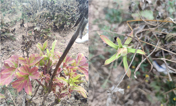 記者發現,此次開放的牡丹均勻分布在園區幾個片區,有粉色、黃色、紅色、白色四種色系將近二十余株。一株百年“花王”牡丹也不甘落后,吐出了花蕾。同時,記者也驚喜地發現還有幾十株牡丹抽出了新枝,結出了花苞。