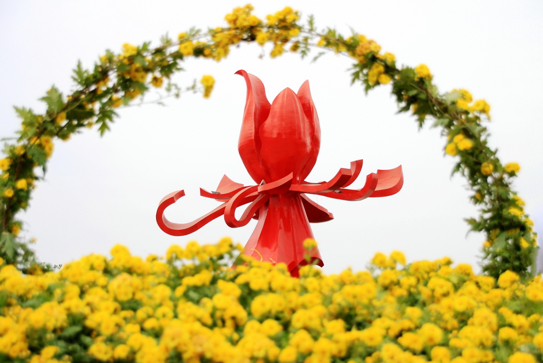 五大展區具體為:“牛氣沖天”展區,以菊牛造型迎接八方游客,寓意中華民族日益強大,牛氣十足;“繁榮昌盛”展區,以國花魂為背景,擺設大型花壇,花團錦簇,寓意國富民強;“龍鳳呈祥”展區,以國花門為中心,東、西兩側的龍鳳造型及花廊,寓意龍鳳呈祥,祝福祖國人民吉祥安康;“太平盛世”展區,以觀花樓為中軸線,擺放大型鐵藝造型、草編花瓶及九龍壁,寓意國泰民安,太平盛世;“花好月圓”展區,以西門牡丹鼎為背景,擺放月彎草編造型,寓意中秋節花好月圓。