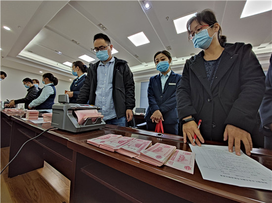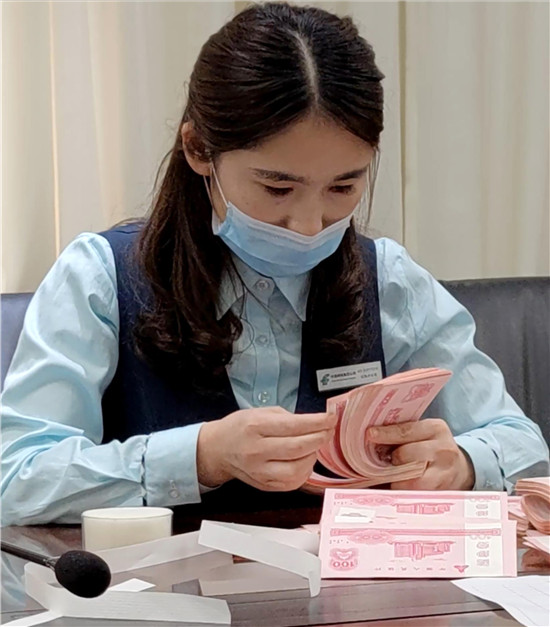 據介紹,此次比賽時間為4分鐘,要求選手使用單指單張點數鈔券的方式,按照抓把、點數、捆扎、蓋章的順序,對給定的點鈔券,在準確的前提下,完成盡可能多的點鈔操作,未按規定的流程操作、未使用單指單張點數鈔券、點數不準確,均會被判零分。