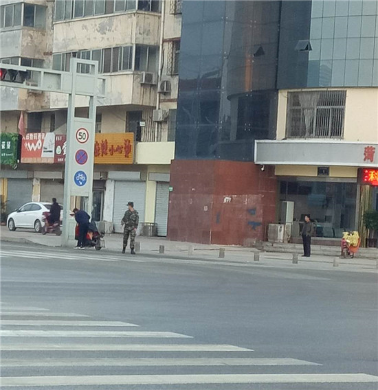 就在這時,一位身穿迷彩服、戴口罩的小哥從市西安路南側沖了出來,飛奔過去,扶起摔倒男子。只見“迷彩小哥”詢問男子情況后,便幫其把電動車扶起,確認他無大礙后才離開,還不時回頭查看摔倒男子的情況。