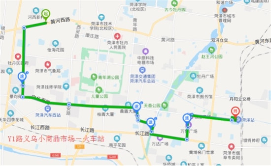 Y1公交線路走向:義烏小商品市場-黃河路-重慶路-中華路-牡丹路-中山路-太原路-長江路-和平路-中華路-桂陵路-火車站,共34個站點,分別為:火車站、金鼎鳳凰城、移動公司、聯通公司、銀座商城、新蘇天美、亨通園西門、市實驗小學南校區、長江路和平路西口(單)、萬達廣場、太原路長江路北口、中山路牡丹路東口、牡丹路中華路南口(單)、牡丹路中山路北口(單)、市建筑設計院、中華路青年路西口(單)、牡丹區檢察院(單)、市政工程處、中國工商銀行(牡丹支行)、牡丹區公安局、二十一中、億聯時代奧城、潤澤·中心之城、中心血站(單)、文心花園(單)、金盾小區南門、金盾小區西門、劉菜園、文苑小區西門、奧斯卡春城、中共牡丹區委黨校(單)、牡丹區實驗中學、現代城、中北·西城一品、義烏小商品市場。