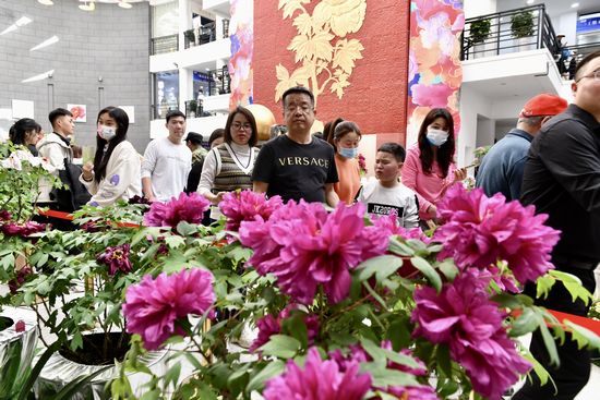 4月10日, 游客在曹州牡丹園國花館內(nèi)欣賞精品盆栽牡丹。最美四月天,菏澤各大牡丹觀賞園的牡丹如約綻放,花開成海,滿城飄香。來到菏澤,除了能欣賞室外盛開的大田牡丹花海,也能品鑒姹紫嫣紅的精品盆栽牡丹。記者 張嘯 攝