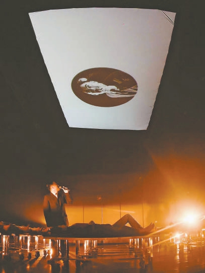 因為劇名的青年文化特征和形式的新穎,“新浪潮戲劇”導演王翀的《躺平2.0》今年格外吸睛。這個每場只有24位觀眾的作品,是他與人工智能聯合編劇、讓觀眾“躺著看”的戲。按照要求,觀眾入場前要脫掉鞋襪、寄存手機,然后如同要進入醫院的病人,躺在演員推來的滾輪床上依次被接入劇場。開場后,他們被演員推床換位,分組相互觀看,向AI提問,并在攝像機的壓迫下接受關于自己墓志銘設想的現場隨機采訪,同步影像被傳輸到劇場頂棚,成為其他觀眾躺著看的對象。由此,在“躺平”與“死亡”的雙關話題中,他們不僅僅是觀眾,也參與了表演。從本質上看,《躺平2.0》是一場創造全新劇場體驗的戲劇游戲。