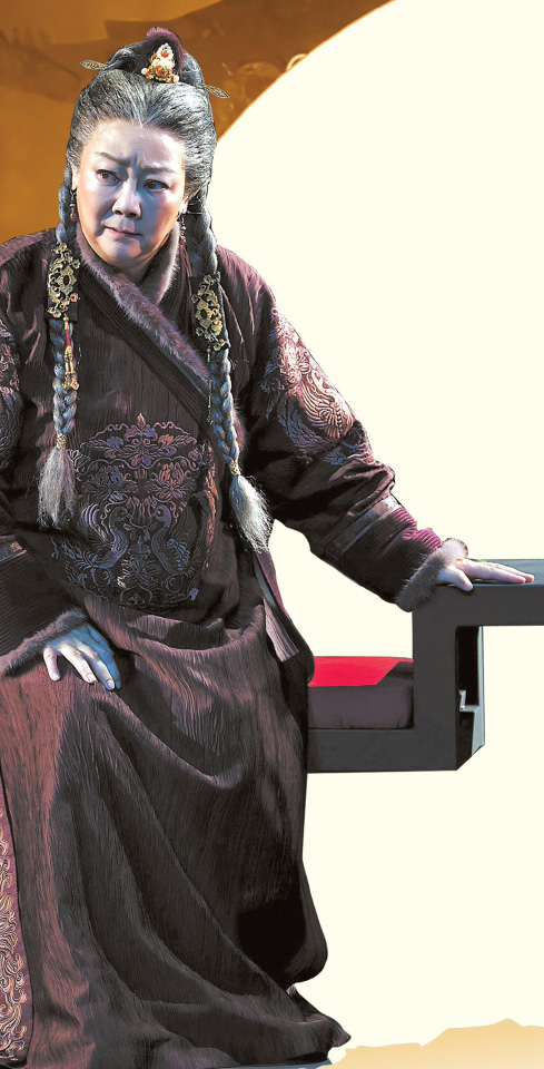 做造型時(shí),薩日娜擔(dān)心自己腰粗系腰帶不好看,便向服裝設(shè)計(jì)提出把放到腰上的飾物換到頭部或臉上,于是有了頭上的兩條辮子,而這樣的設(shè)計(jì)也并不違和,“那時(shí)女真人已經(jīng)開始漢化了,這兩條辮子也讓我的形象在舞臺(tái)上區(qū)別于其他的老太太,多了邊塞民族的那股勁兒。”