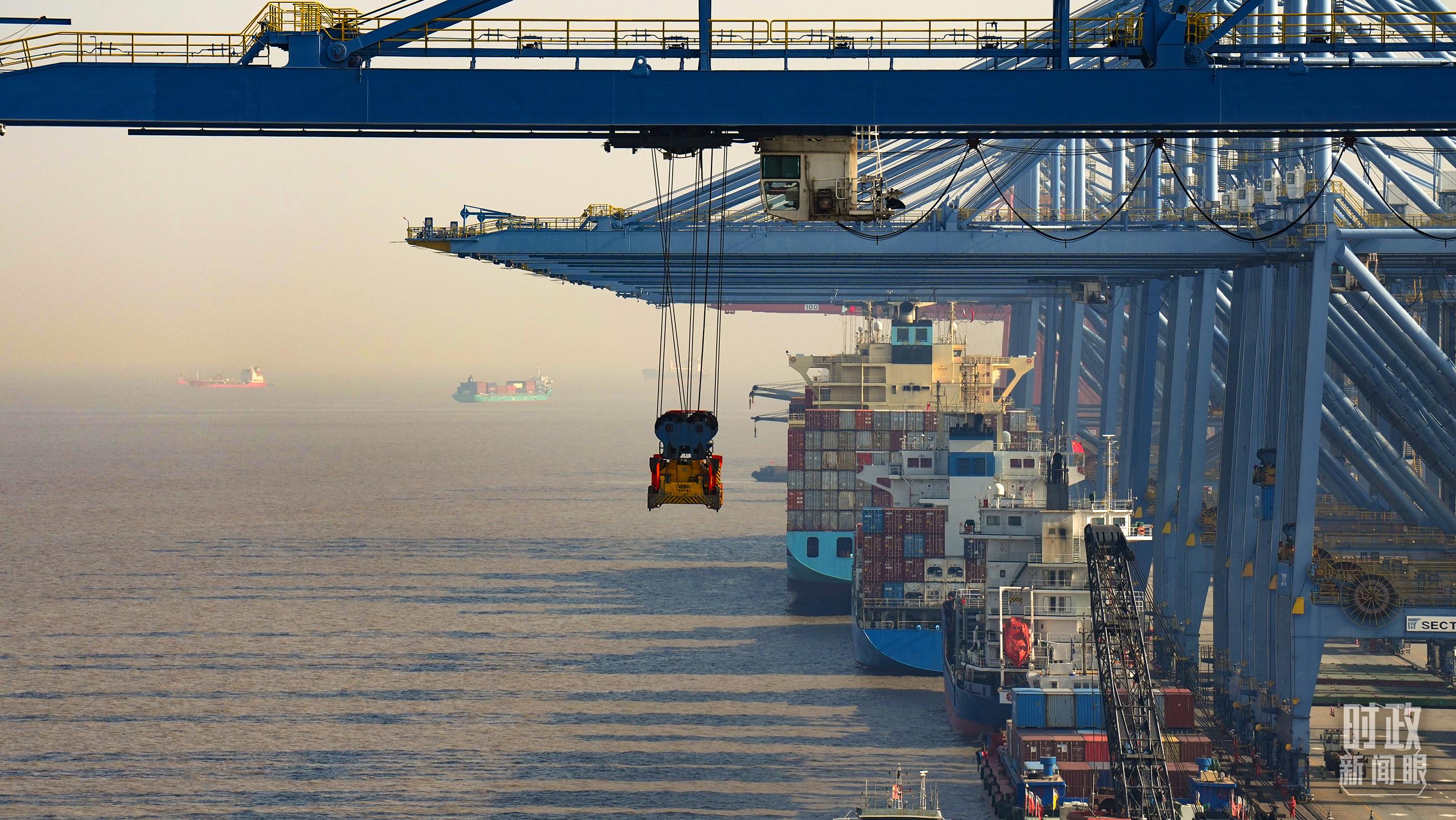 △上港集箱外高橋碼頭,巨型塔吊正在吊裝集裝箱貨柜。(總臺國廣記者李晉拍攝)