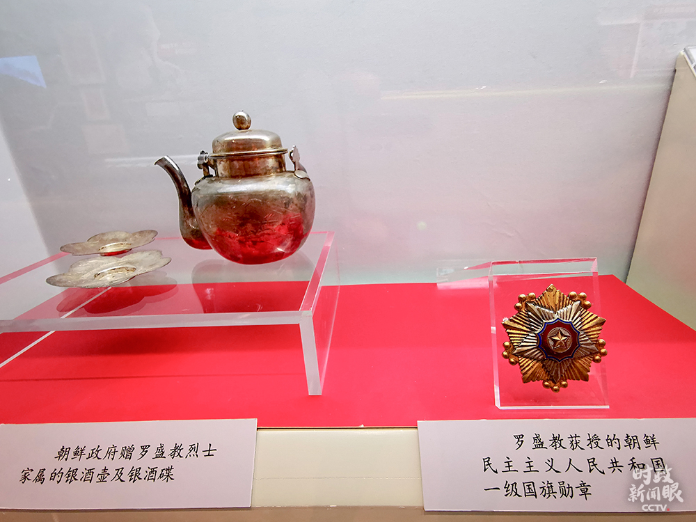 △左為朝鮮政府贈給羅盛教烈士家屬的銀酒壺、銀酒碟,右為羅盛教獲授的朝鮮民主主義人民共和國一級國旗勛章。(總臺央視記者荊偉拍攝)