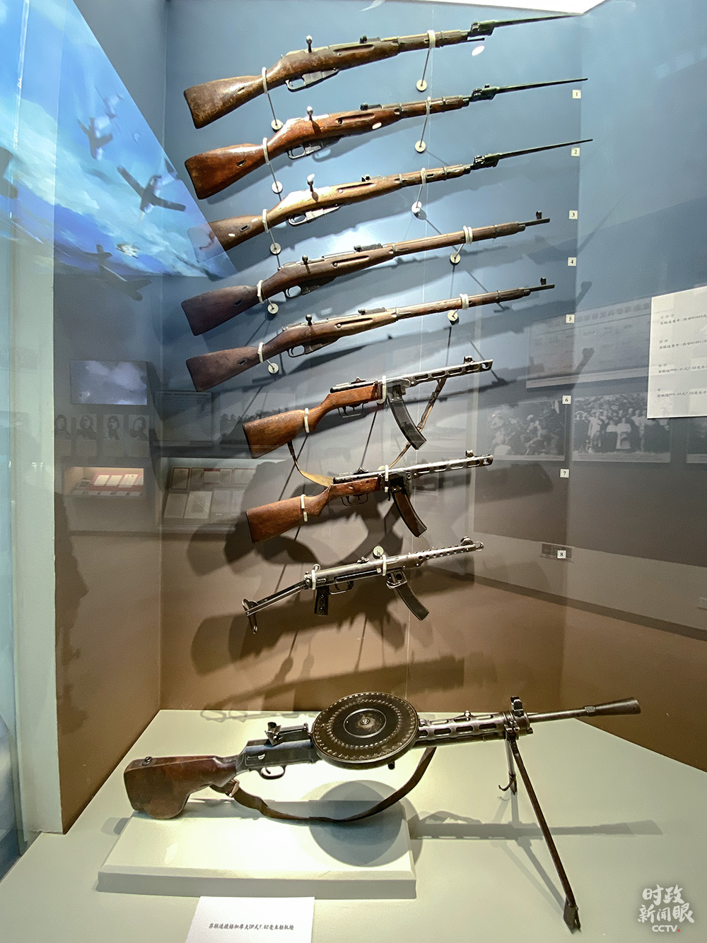 △圖中最下面是捷格加廖夫輕機槍,彈盤裝彈數量多。抗美援朝戰場上,志愿軍曾使用過這種火力兇猛的蘇式機槍。(總臺央視記者李輝拍攝)