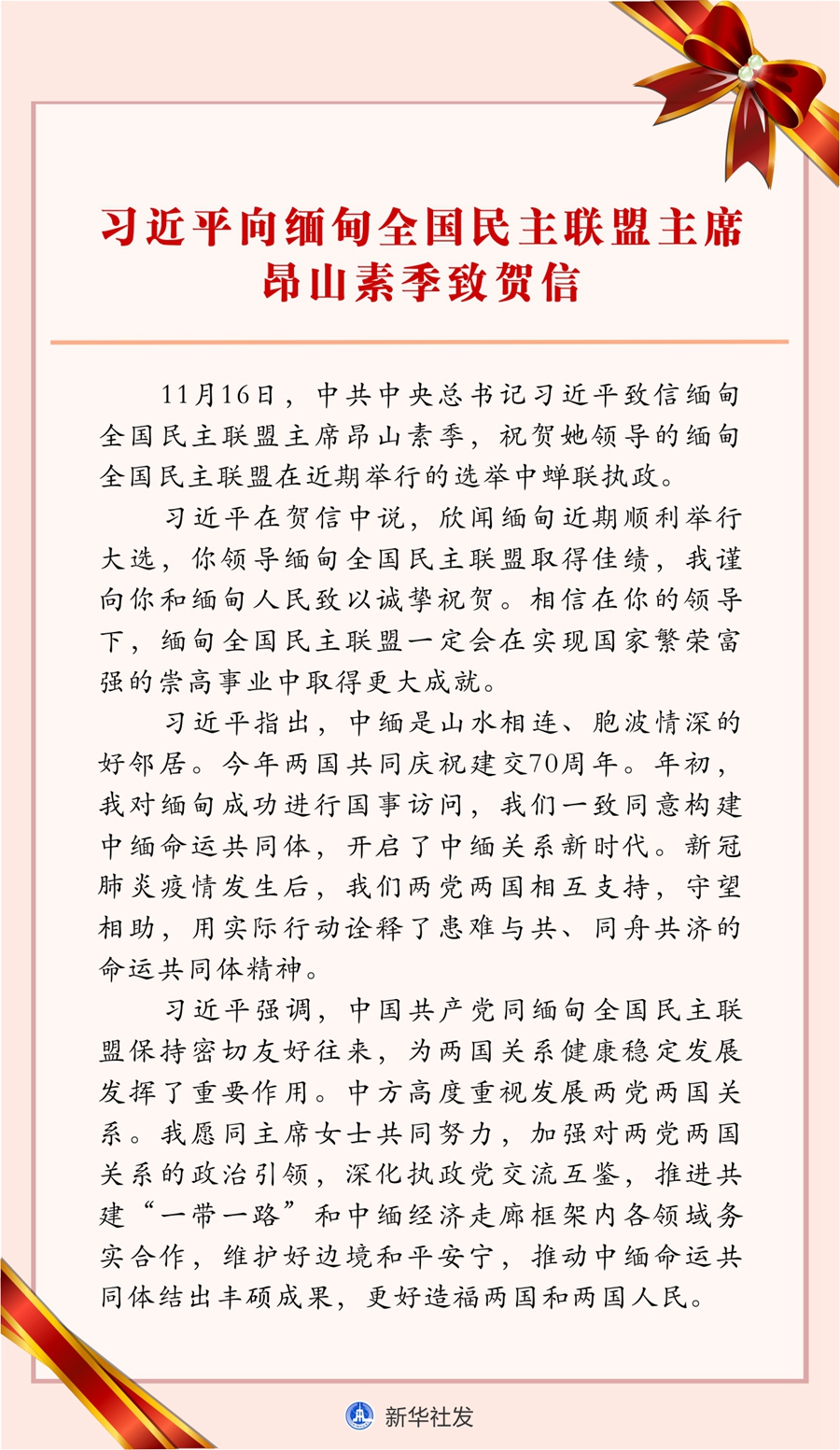 新華社北京11月17日電 11月16日,中共中央總書記習近平致信緬甸全國民主聯盟主席昂山素季,祝賀她領導的緬甸全國民主聯盟在近期舉行的選舉中蟬聯執政。