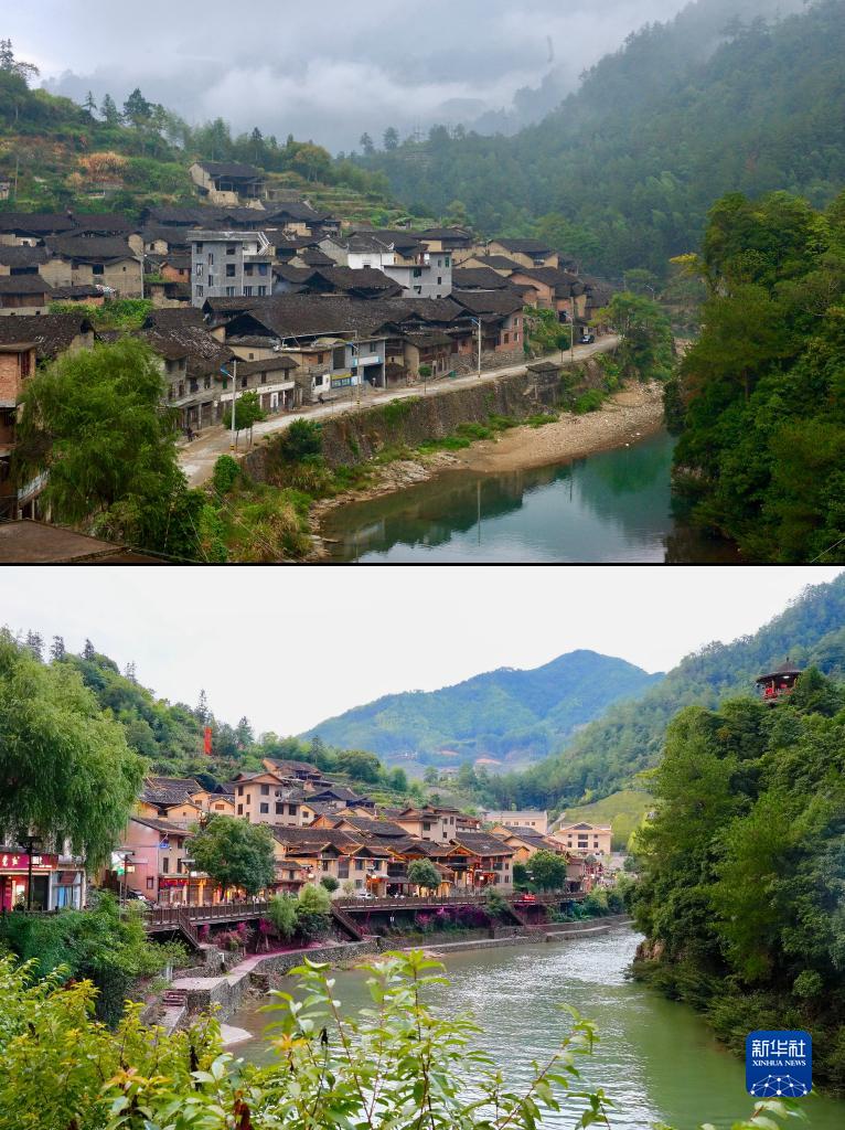 拼板照片:上圖為2014年10月22日拍攝的寧德市壽寧縣下黨鄉下黨村村貌(新華社記者姜克紅攝);下圖為2023年8月5日拍攝的寧德市壽寧縣下黨鄉下黨村新貌(新華社記者林善傳攝)。新華社發