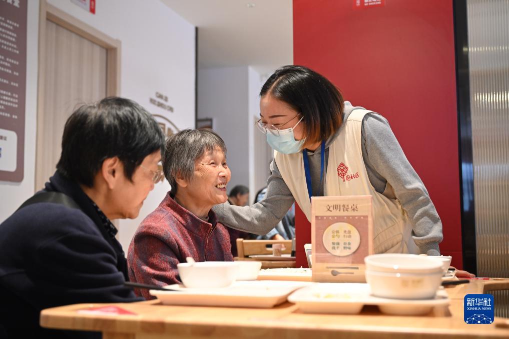 2023年11月16日,社區工作人員在福州市鼓樓區慶城社區長者食堂內與用餐老人交流。新華社記者 姜克紅 攝