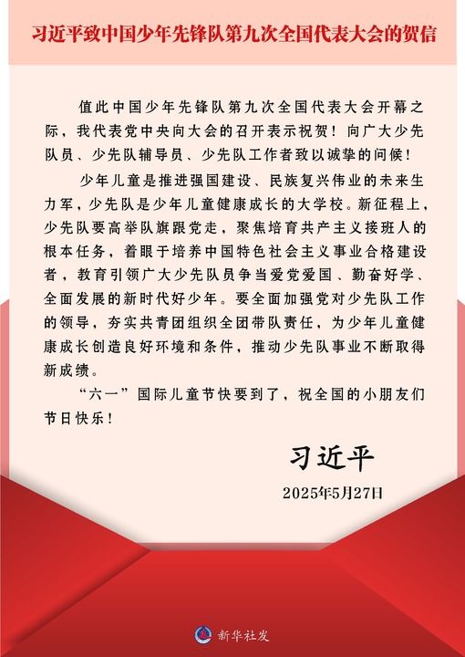 新華社北京5月27日電?“六一”國際兒童節即將到來之際,中國少年先鋒隊第九次全國代表大會27日上午在京開幕。中共中央總書記、國家主席、中央軍委主席習近平發來賀信,代表黨中央向大會的召開表示祝賀,向廣大少先隊員、少先隊輔導員、少先隊工作者致以誠摯的問候,并祝全國的小朋友們節日快樂。