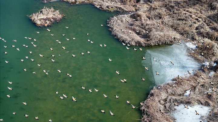 候鳥在黃河寧夏段一處濕地棲息、覓食(2025年2月26日攝,無人機照片)。新華社記者 王鵬 攝