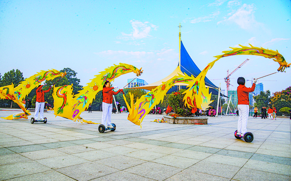 10月15日,黨的二十大開幕前夕,在鄆城風帆廣場,山東華龍健身俱樂部的健身愛好者們滿懷激情舞起“彩帶龍”,展示幸福生活,慶祝盛會召開。通訊員 王忠憲