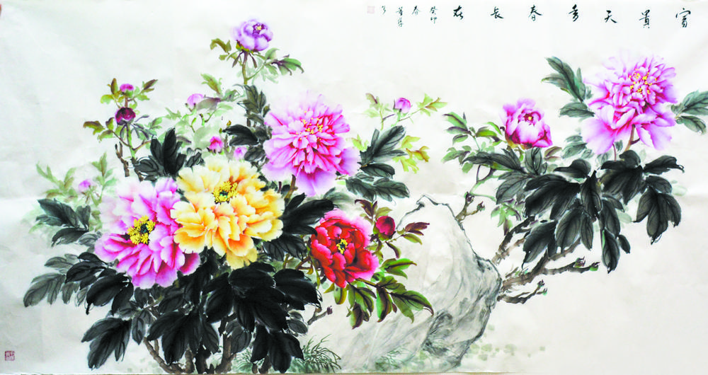 活動現(xiàn)場,書畫家呂福龍、田立、董萍、成磊、黃國強(qiáng)、伍萍飽蘸激情、揮毫潑墨,一上午創(chuàng)作出多幅不同風(fēng)格的作品,繪畫作品及各種書體的書法作品鋪滿整個展廳。這些作品多以用牡丹、山水等形式表達(dá)對生活的美好向往和對藝術(shù)理想的追求。