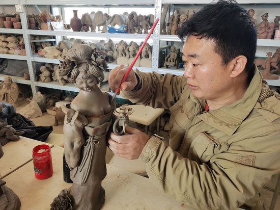 日前,記者來到成武縣文亭街道劉康莊行政村,在曹州泥偶陶藝非物質文化傳承人康志敏的陶藝工作室里,他正手拿工具,細心為燒制好的陶藝上色(如圖)。
