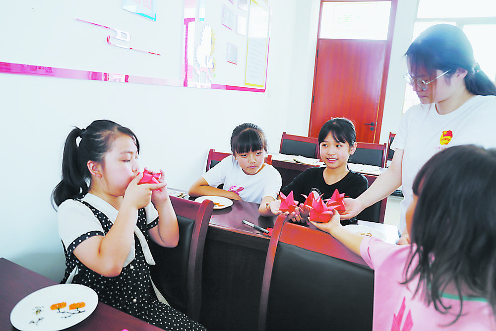 “貼上一朵小紅花,看看漂亮不漂亮?”7月19日,在東明縣長興集鄉興東新村“小荷學堂”上,十余名孩子正在大學生志愿者的帶領下上折紙手工課。