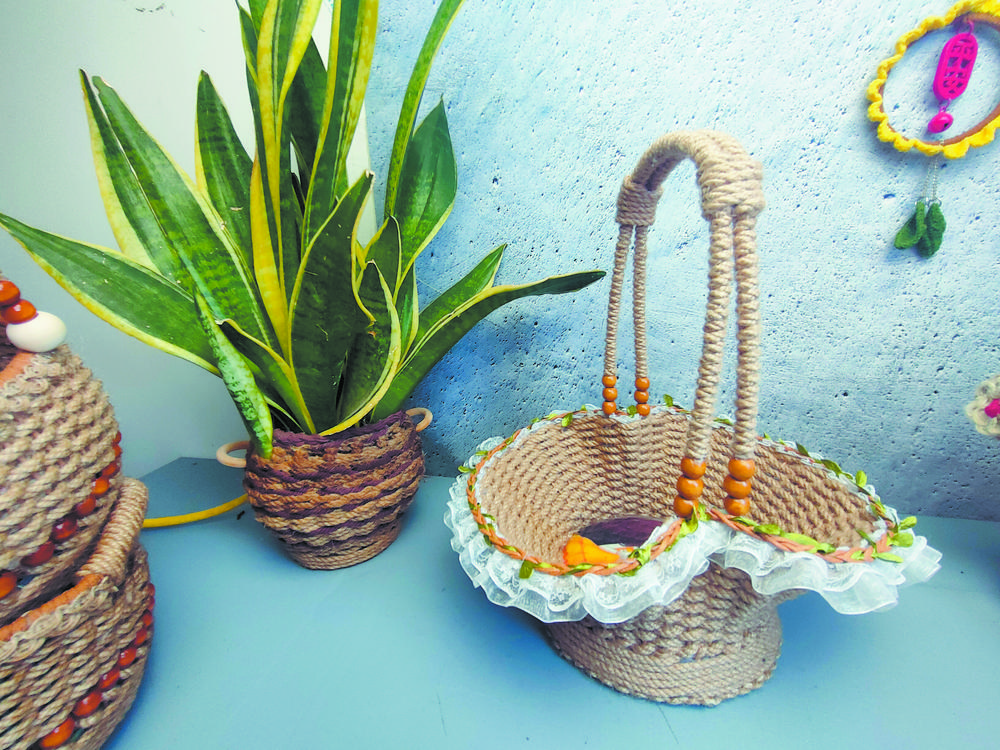 蔡海麗告訴記者,剛開始學習的時候,她會編織一些比較小、工藝相對簡單的作品,比如筆筒、花盆等。很多時候,她都是將家里廢棄的物品通過麻編變成美觀且實用的物品。“就拿這個花盆來說,最里面是一個打包餐盒,下面打個洞可以流水,里面放上土,最外面是用麻繩編織的,這樣看著就比普通的花盆更加美觀,而且材料都來源于生活。”