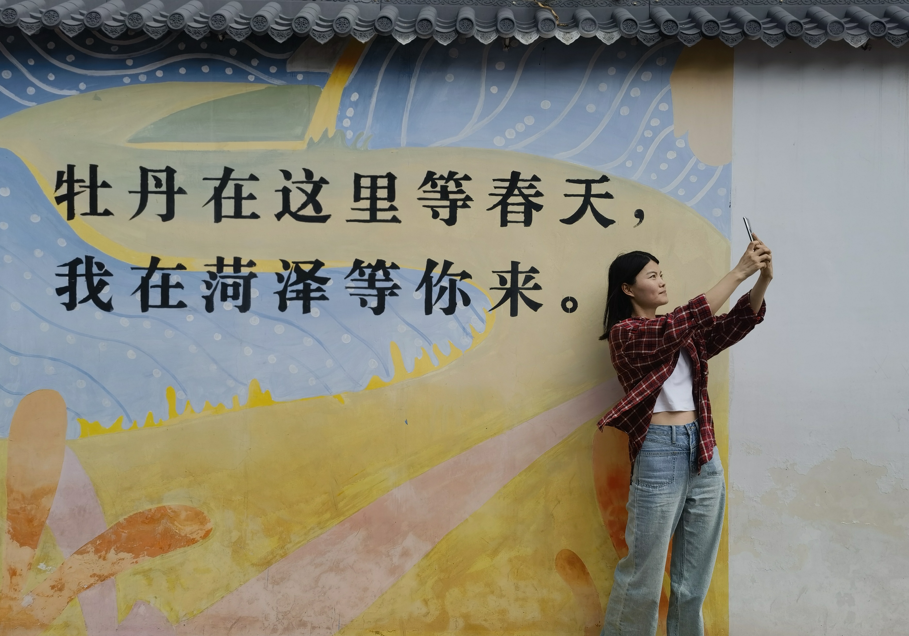 居民在墻繪前自拍