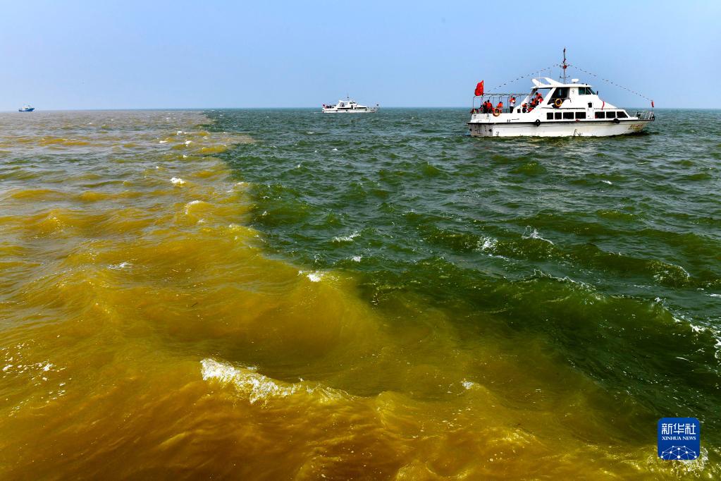 在山東省東營市黃河入海口,黃河匯入渤海,形成獨特景觀(5月13日攝)。新華社記者 郭緒雷攝