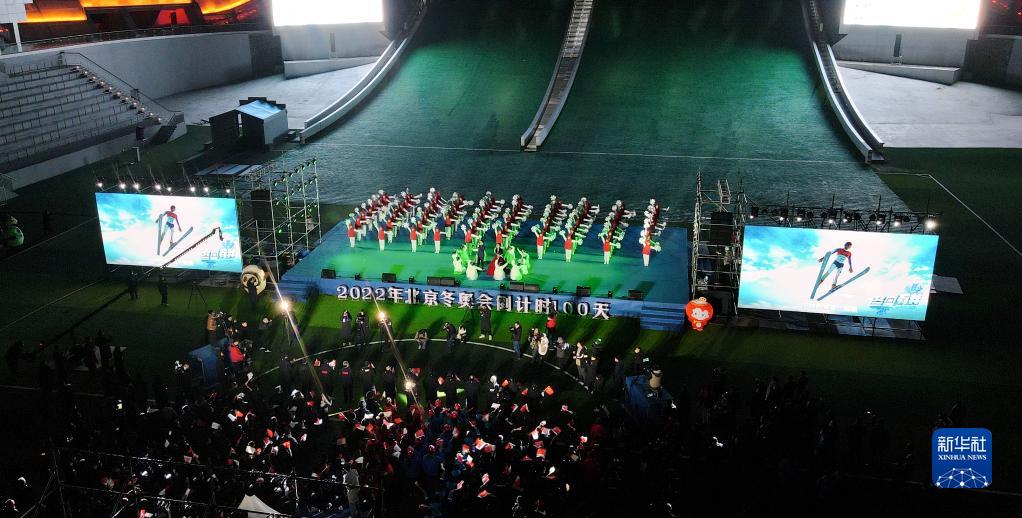 10月26日,“來自崇禮的邀約”——北京2022年冬奧會倒計時100天慶祝活動在河北省張家口市崇禮區國家跳臺滑雪中心“雪如意”舉行(無人機照片)。新華社記者 金皓原 攝