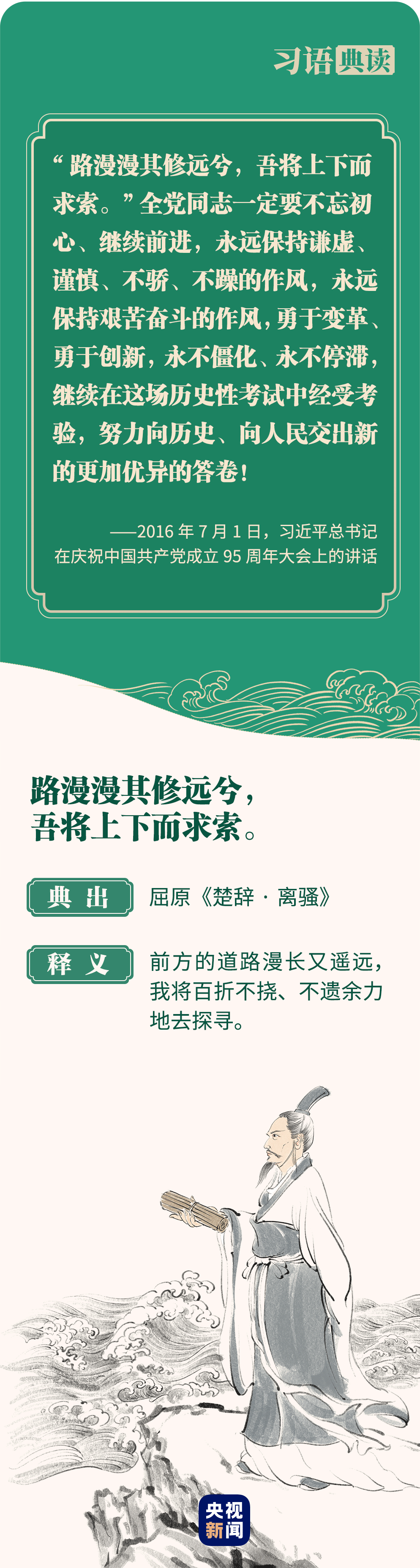 “路漫漫其修遠兮,吾將上下而求索。”黨的十八大以來,習近平總書記多次引用屈原的名句,鼓舞和激勵全黨全國各族人民勇于變革、勇于創新,風雨無阻、勇敢前進。