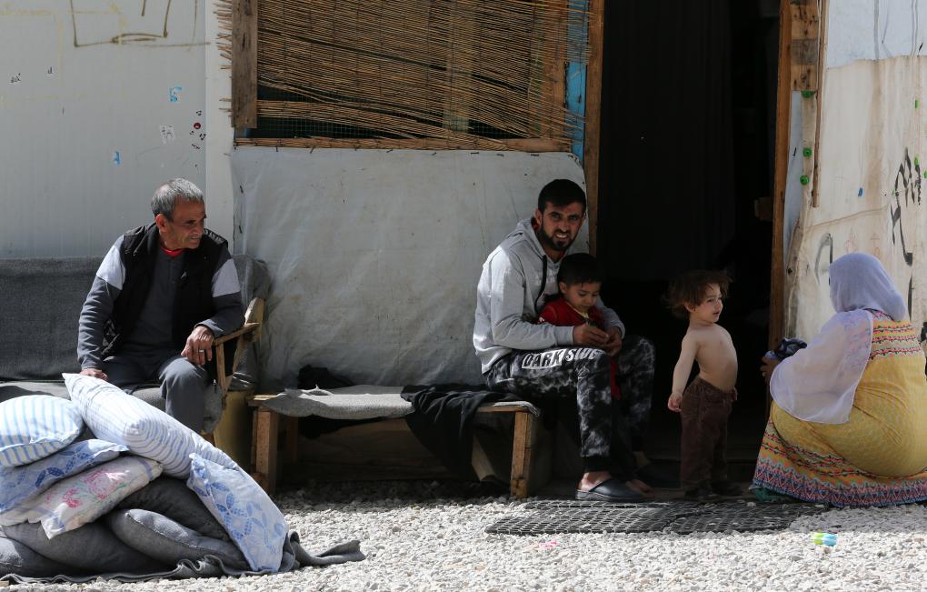 2018年4月12日,在希臘雅典以北約86公里處的里措納難民營,一對夫婦照顧孩子。新華社發(馬里奧斯·羅洛斯攝)
