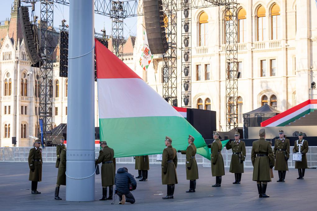 這是3月15日在匈牙利布達(dá)佩斯國(guó)會(huì)大廈前的科蘇特廣場(chǎng)拍攝的民族節(jié)升旗儀式現(xiàn)場(chǎng)。新華社發(fā)(鮑拉日·塞凱伊希迪攝)