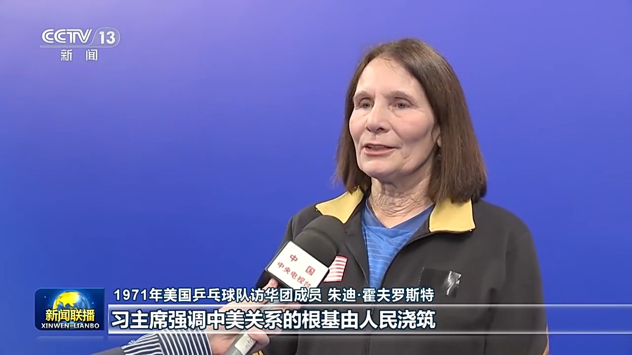 1971年美國乒乓球隊訪華團成員 朱迪·霍夫羅斯特:習主席強調中美關系的根基由人民澆筑,這一點我深有感觸。在當下,相互理解與對話比任何時候都更加重要,我也希望我們能將“乒乓外交”精神繼續傳承,在兩國人民間傳遞溫情,增進理解。