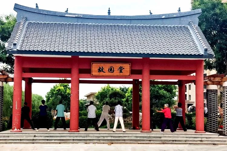 仿古建筑故園堂,市民晨起健身忙。