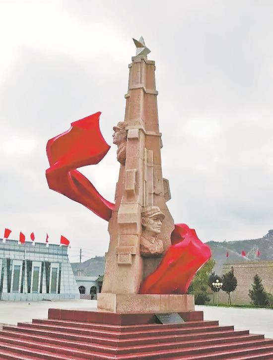 走進紅軍會寧會師舊址,廣場一側矗立著雕塑《地球上的紅飄帶》,在陽光映襯下熠熠生輝。
