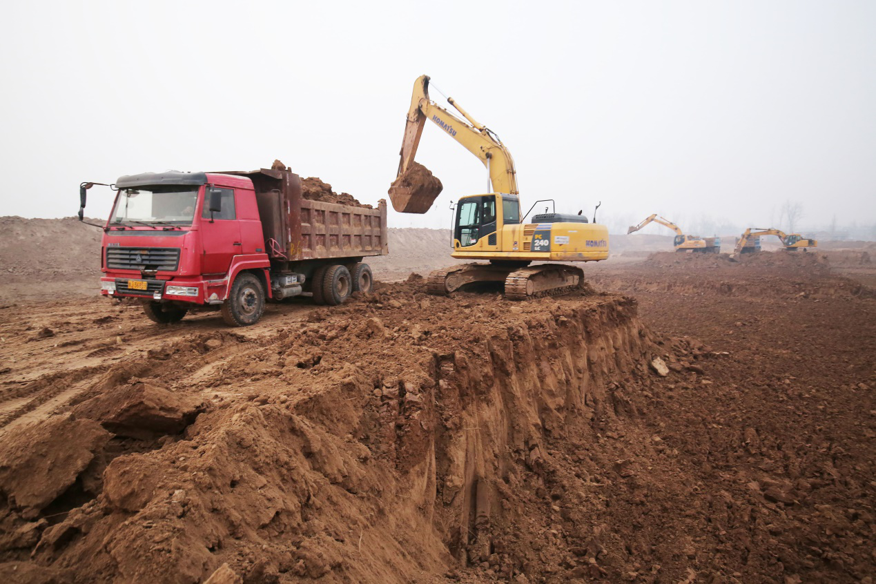 2018年6月25日暴雨過后的大邢莊村臺。鄄城房臺建設人員赤腳檢查村臺暴雨承受能力,確認安然無恙方才歇腳。抽沙必然引水,這就導致村臺含水量高,經過4個多月的自然沉降,克服重重困難,村臺終于達標開工建房。