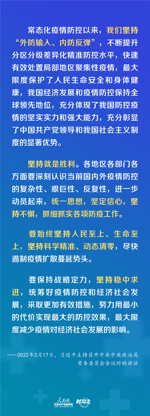 堅(jiān)持就是勝利,堅(jiān)持才能勝利。中共中央政治局常務(wù)委員會(huì)3月17日召開會(huì)議,分析新冠肺炎疫情形勢(shì),部署從嚴(yán)抓好疫情防控工作。中共中央總書記習(xí)近平主持會(huì)議并發(fā)表重要講話。維護(hù)和鞏固我國來之不易的疫情防控成果,這場(chǎng)會(huì)議六次提到“堅(jiān)持”。