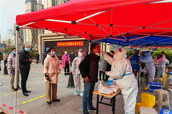 20日上午,記者在丹陽(yáng)街道仝莊社區(qū)核酸采樣點(diǎn)看到,檢測(cè)現(xiàn)場(chǎng)劃分了信息登記排隊(duì)區(qū)、等候區(qū)、采樣區(qū)等,待檢人員保持前后一米間隔排隊(duì)等候。身穿防護(hù)服的“大白”們正在緊張忙碌著,在志愿者的協(xié)調(diào)、引導(dǎo)下,檢測(cè)現(xiàn)場(chǎng)秩序井然、運(yùn)轉(zhuǎn)高效。