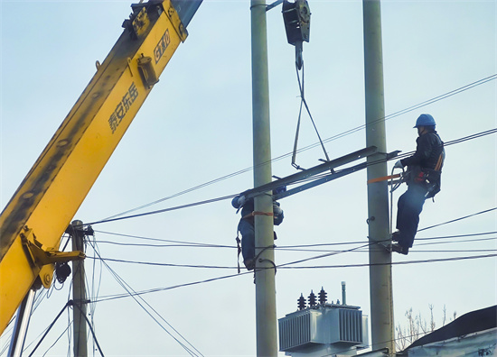 3月15日,在黃河路與牡丹路交叉口,供電施工人員正在對線桿上的電路進行規整作業,通過梳理等方式,對空中線纜集中整治改造,確保線纜排列有序、整潔美觀。