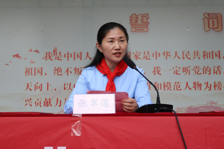 新隊(duì)員代表戴夢(mèng)彤發(fā)言:“花都是快樂(lè)的家園,花都是成長(zhǎng)的搖籃,在花都這個(gè)溫暖的集體中,我們會(huì)用自己的實(shí)際行動(dòng)讓紅領(lǐng)巾更紅,讓隊(duì)旗更亮。”