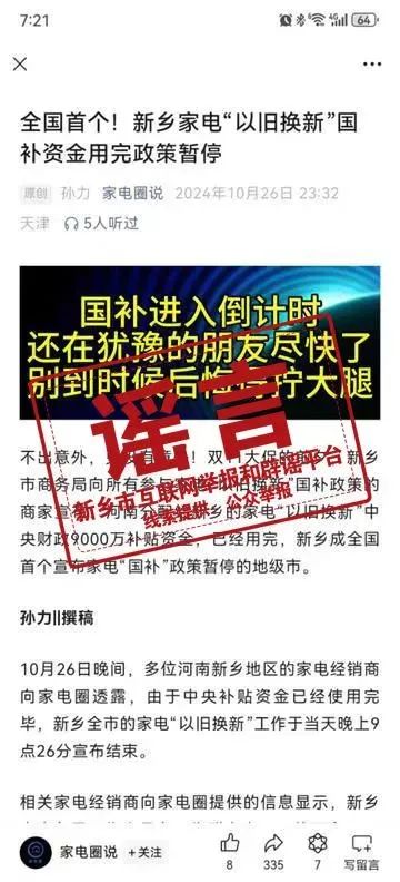 10月26日,有網民在多平臺發布關于“全國首個!河南新鄉家電以舊換新國補資金用完政策暫?!钡奈恼?,聲稱“國補末班車即將結束”“中央財政9000萬補貼資金已經用完”等內容。經查,該信息系謠言。